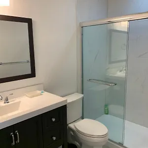 This Vancouver accommodation also comes with a full kitchen and a bathroom with a separate toilet and a shower.